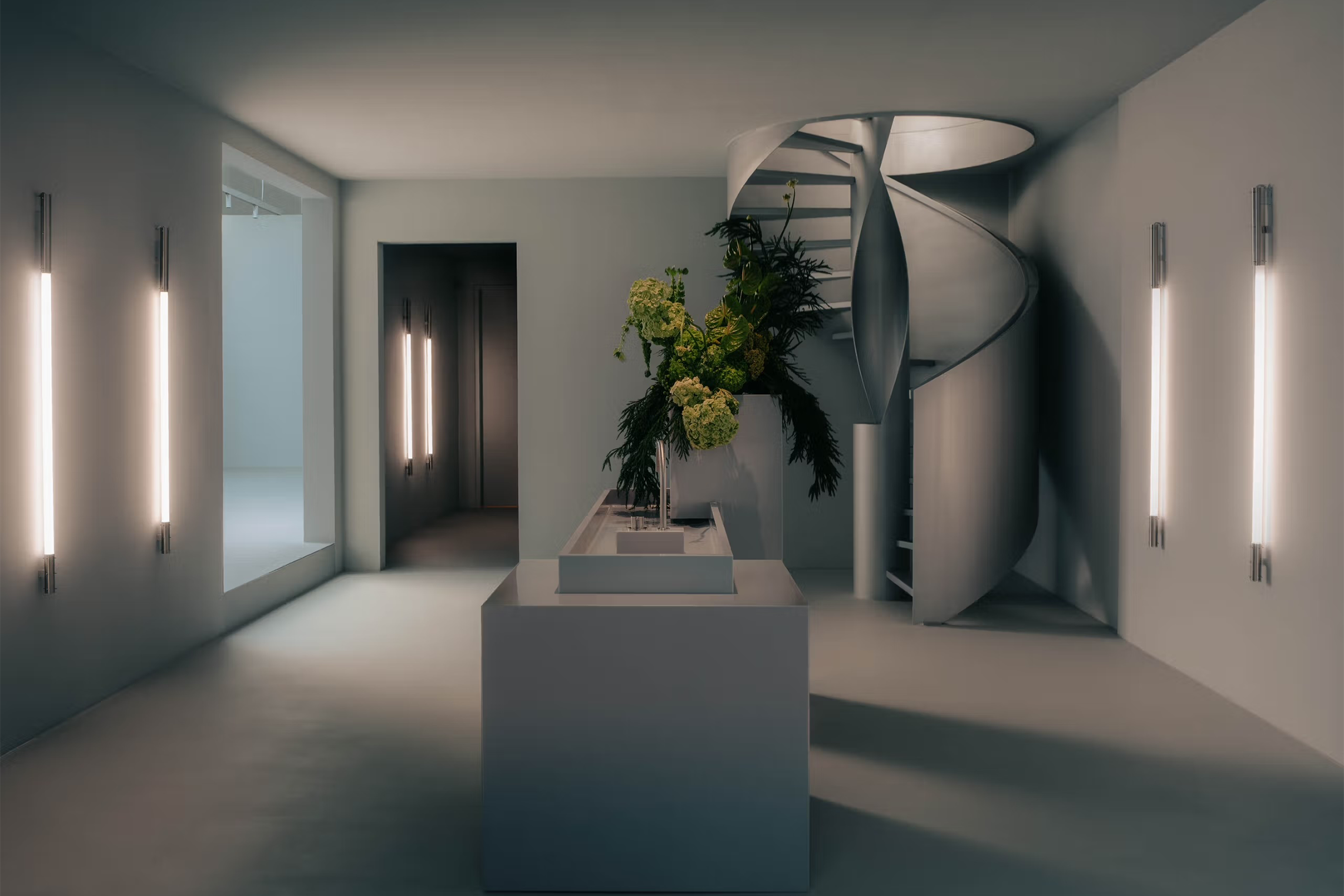 Throughout the space, the palette remains restrained: pale gray walls, polished metal, and diffuse lighting from linear LED fixtures that seem to hover rather than hang. These are not merely decorative decisions, but spatial strategies. The choice of reflective surfaces and softened lines allows light to move fluidly throughout the interior, elongating perspectives and removing any sense of spatial boundary. It’s clinical, yes, but never cold.