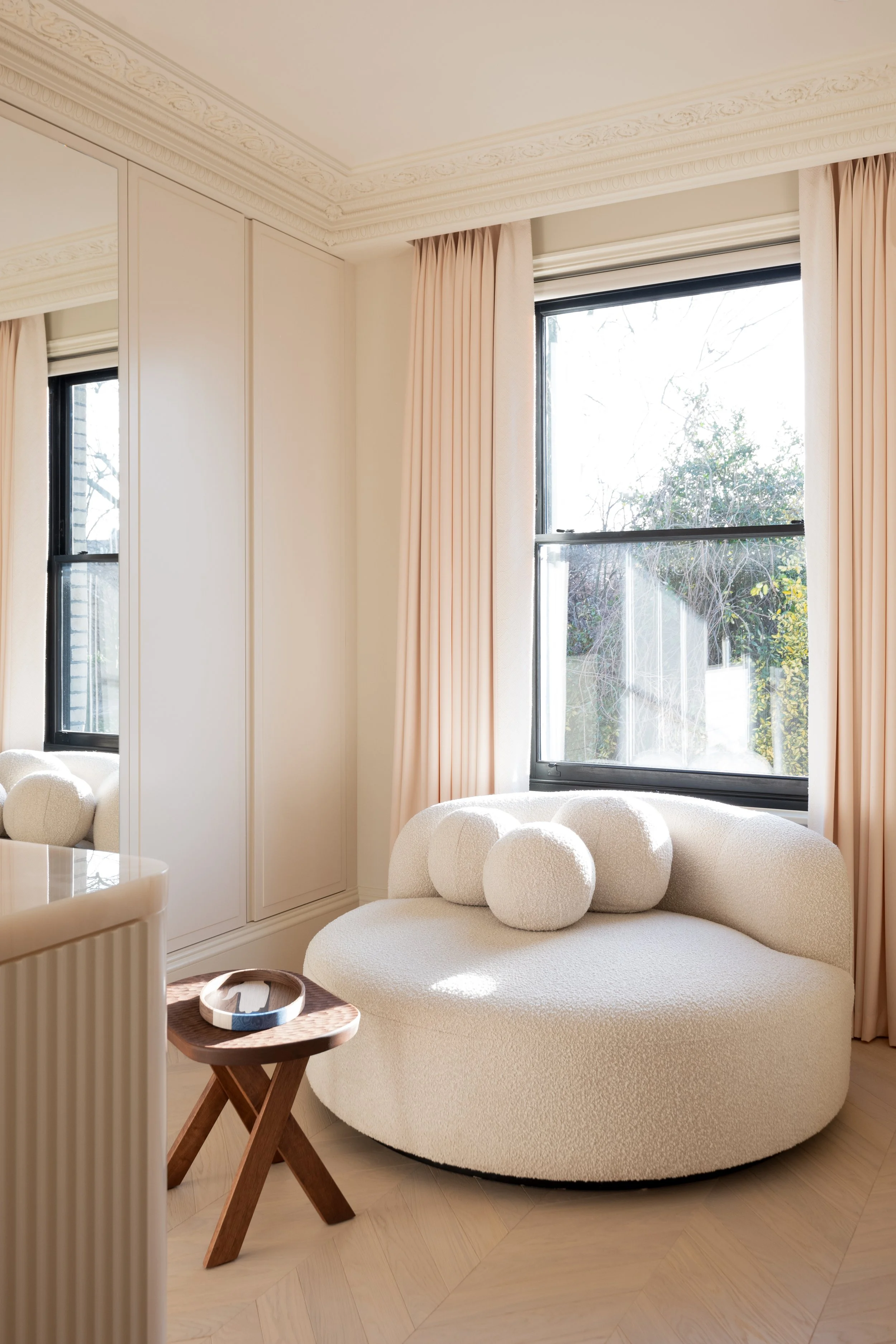 By layering period detailing with sleek, sculptural furniture, the spaces invite a sense of sophistication that feels neither too traditional nor overtly modern. The result is a delicate balance, a thoughtful blend that remains true to the villa’s Victorian roots while presenting an updated, contemporary aesthetic. In every room, from the hallway to the bedroom suites, Arianne’s design approach creates spaces that feel refined and grounded.